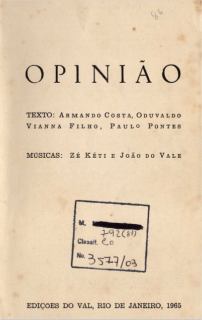 A estreante Maria Bethania substituiu Nara Leão, sua interpretação de “Carcará” conquistou o Brasil. A peça é uma brilhante mistura de canções, textos libertários, denúncia social, anedotas e depoimentos pessoais dos atores. O espetáculo foi gravado, o livro é uma raridade, se eu encontrar links ponho nos comentários.